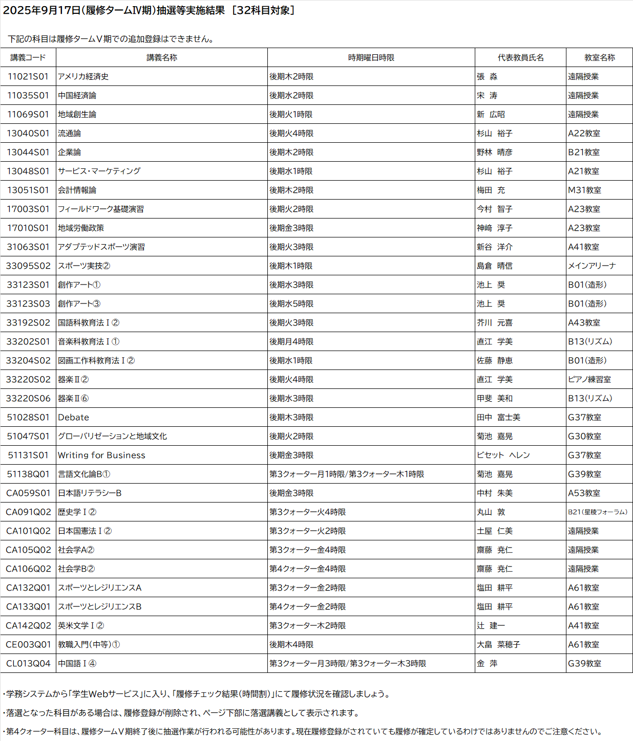 後期・3Q・4Q科目の追加・削除ができますが、履修タームⅣ期までに抽選等が実施された下記の「32科目」は追加登録できません。