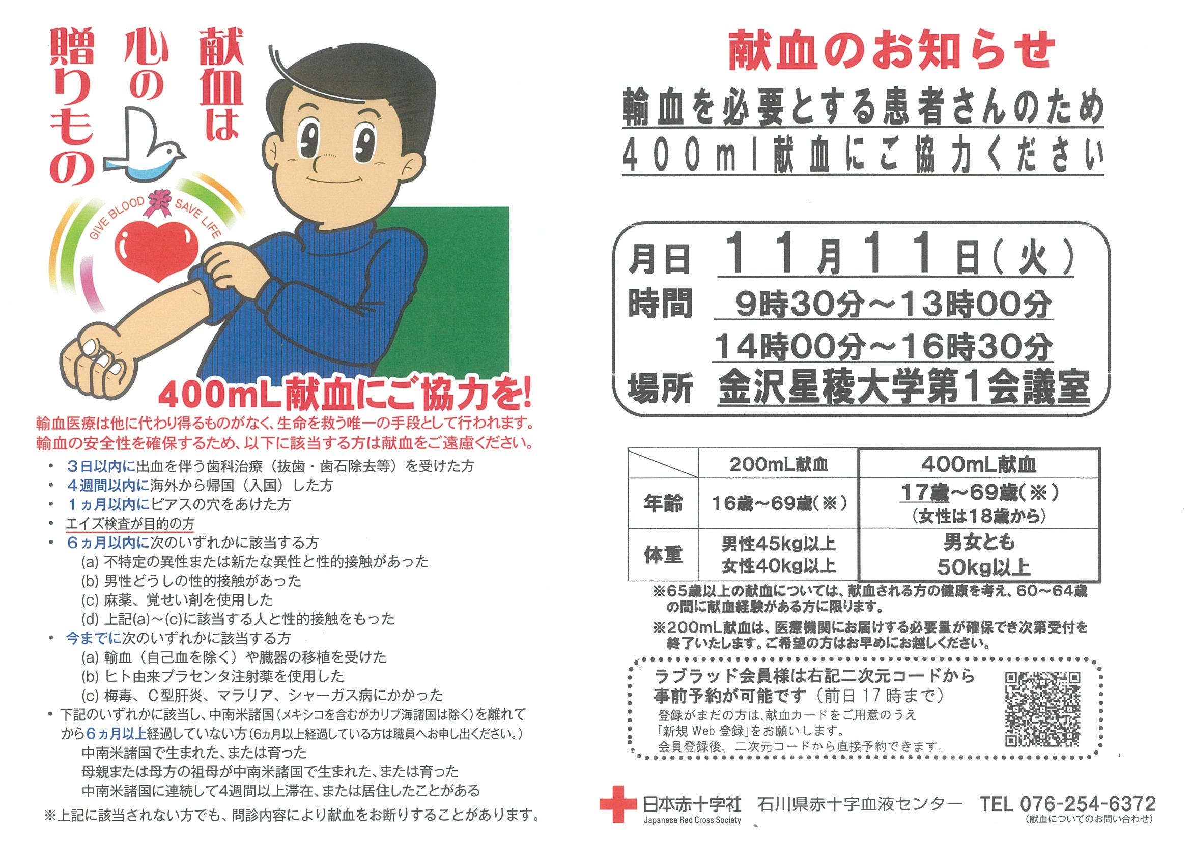 以下の日時・場所において学内献血が行われます。皆さん献血にご協力をお願いします!