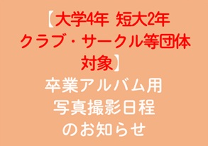【大学4年 短大2年 クラブ・サークル等団体 対象】卒業アルバム用写真撮影日程のお知らせ(11/14更新)