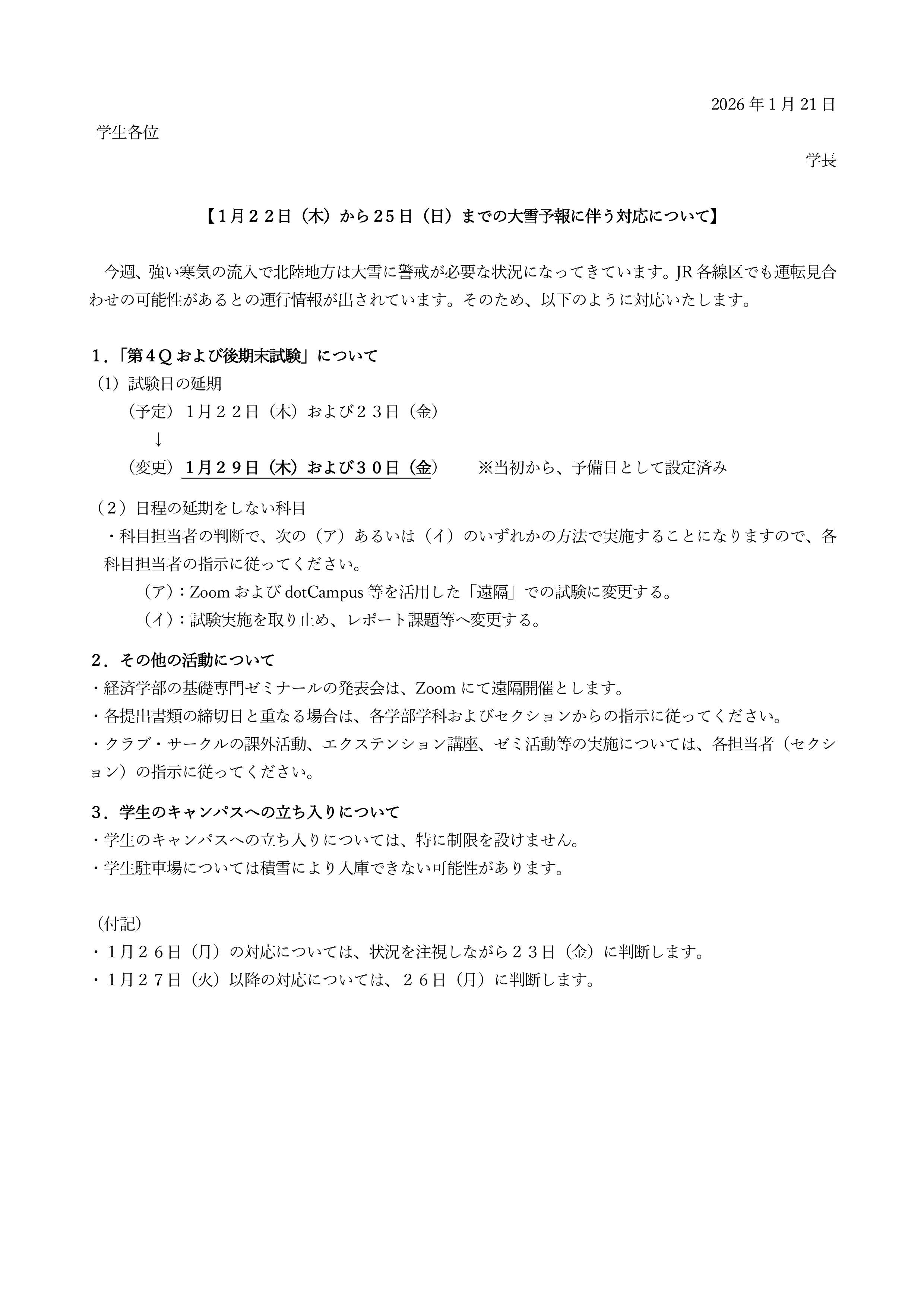 ご案内 1月22日(木)から25日(日)までの大雪予報に伴う対応について 2026.01.21 共通 ※下記の箇所が一部修正がありましたので、更新しました。 1.「第4Qおよび後期末試験」について の(2) 各種お知らせ一覧に戻る
