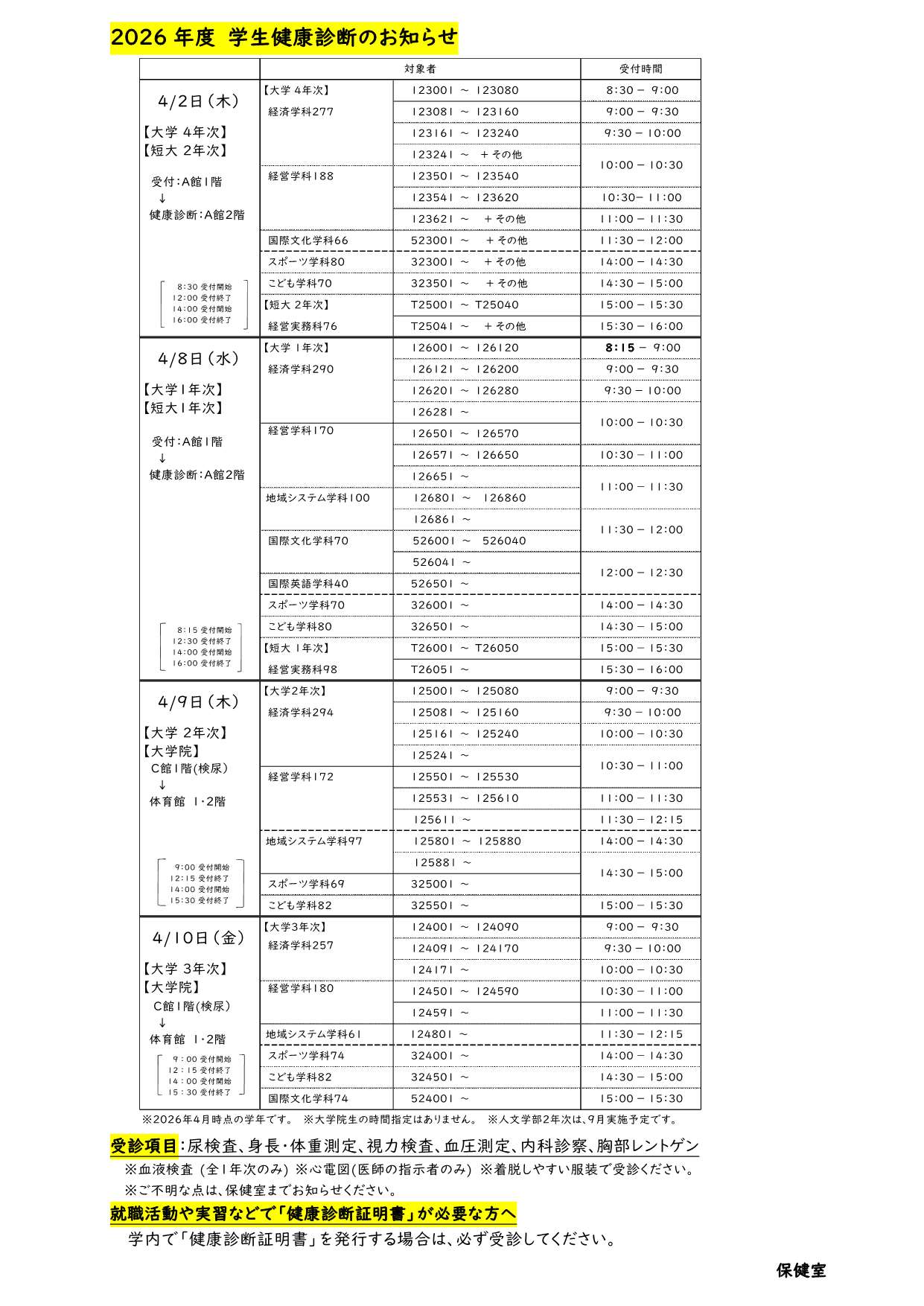ご案内 健康診断のお知らせ(4/6更新) 2026.04.06 共通 健康診断のお知らせ ※指定されている受付時間が授業の時間と重複している場合は、授業出席を優先し、別の時間帯に受診してください。 各種お知らせ一覧に戻る